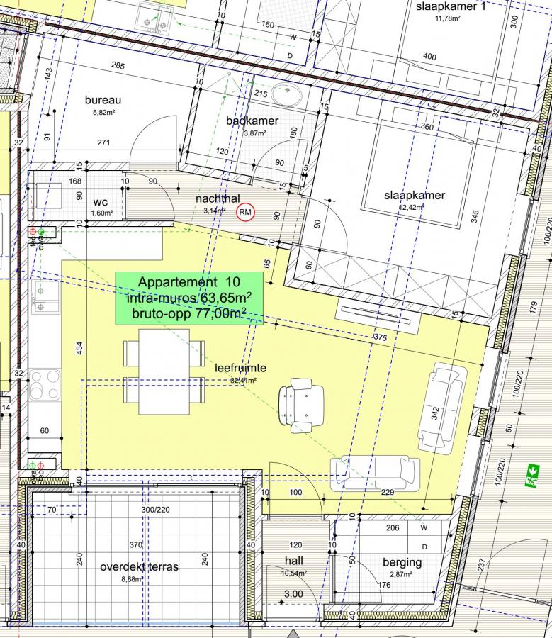 -App 10: 77m² (1 slk + buro met raam) met terras van 8.8m²= 210.000 € excl kosten
