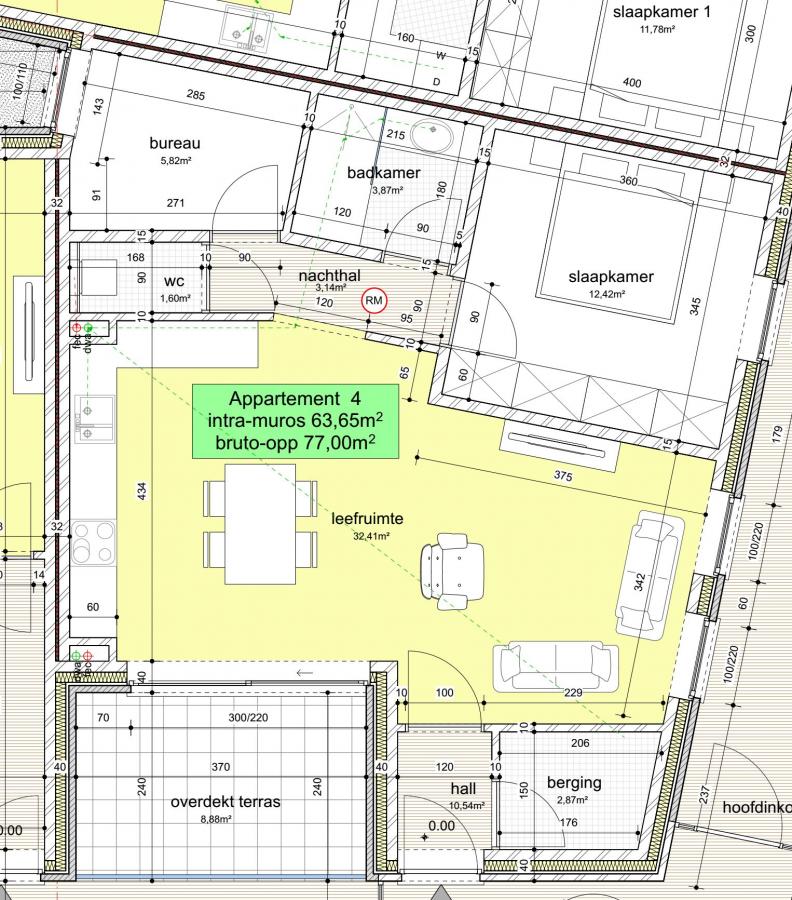 -App 4: 77m² (1 slk + buro met raam) met terras van 8.8m²= 210.000 € excl kosten